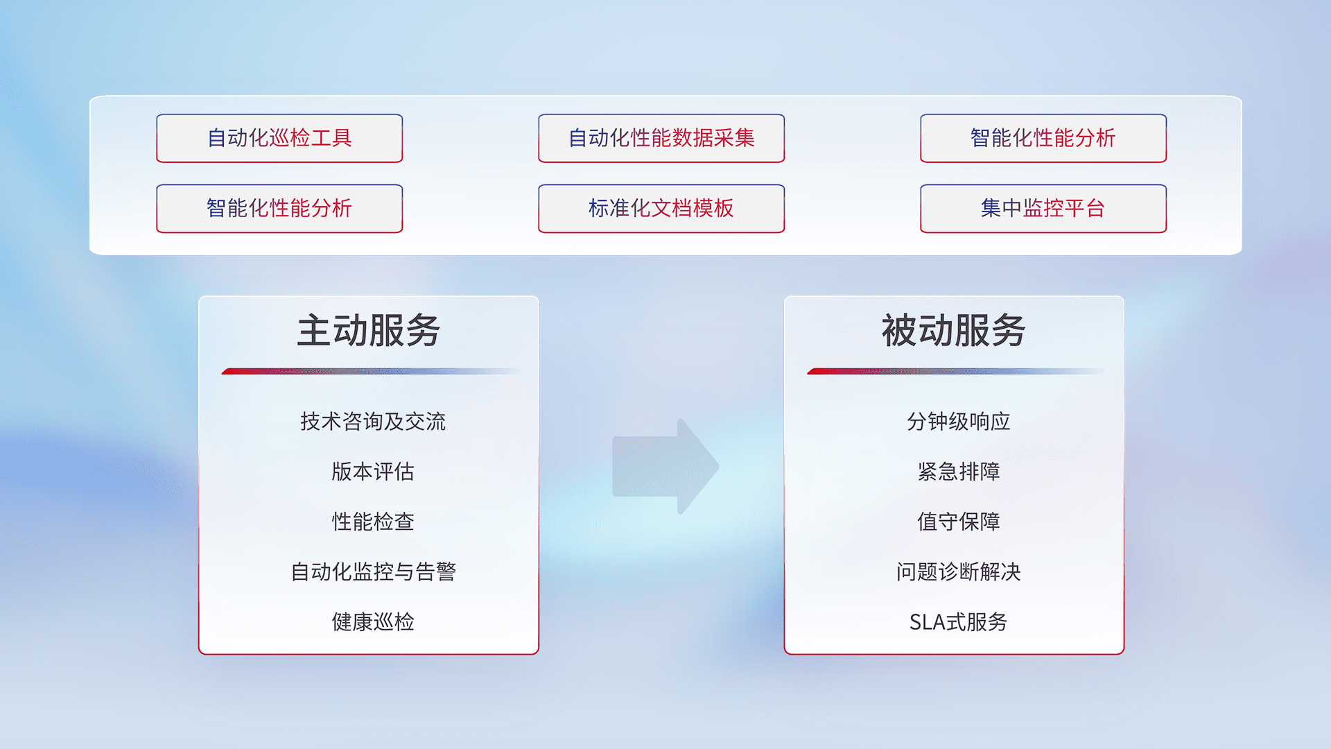 智能化工具和标准化文档,,保障服务质量,,提供主动服务(包含技术咨询、、、、版本评估、、、、性能检查、、、自动化监控与告警、、、健康巡检)和被动服务包含(分钟级响应、、紧急排障、、、值守保障、、、、问题诊断解决、、、SLA服务)。。