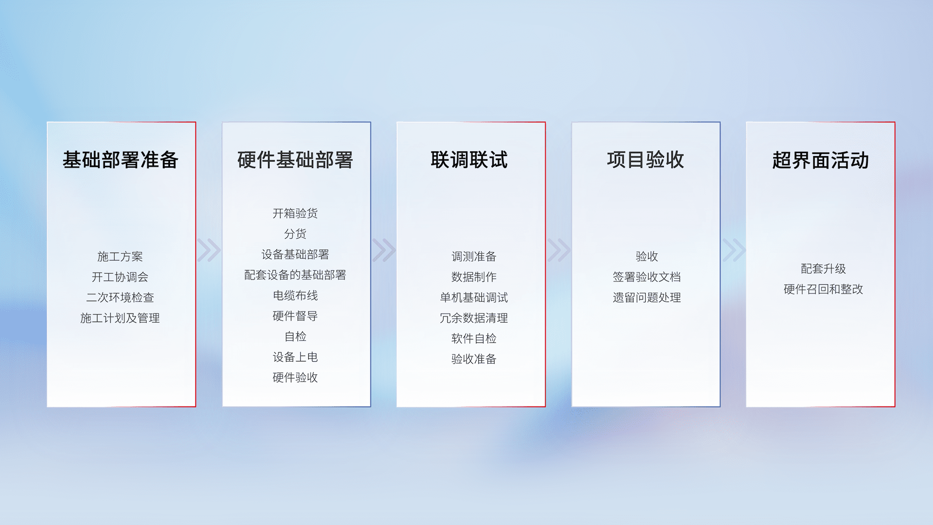 从基础部署准备、、、、硬件基础部署、、联调联试、、、项目验收、、、越界面活动的全过程可追溯,,,,保证施工质量和进度。。